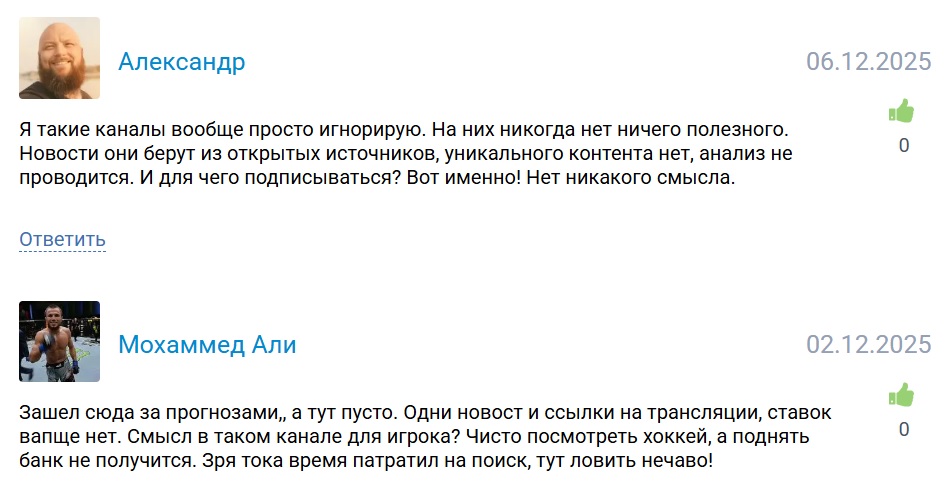 На сторонних ресурсах отзывы негативные. Пользователи пишут жалобы на отсутствие прогнозов, игнорирование сообщений и попытки удалить неудобный отзыв. Многие отмечают, что проект — это не надежный капер, а канал без практической пользы для ставок. Положительные отзывы встречается редко и обычно касается только бесплатного хоккейного контента.