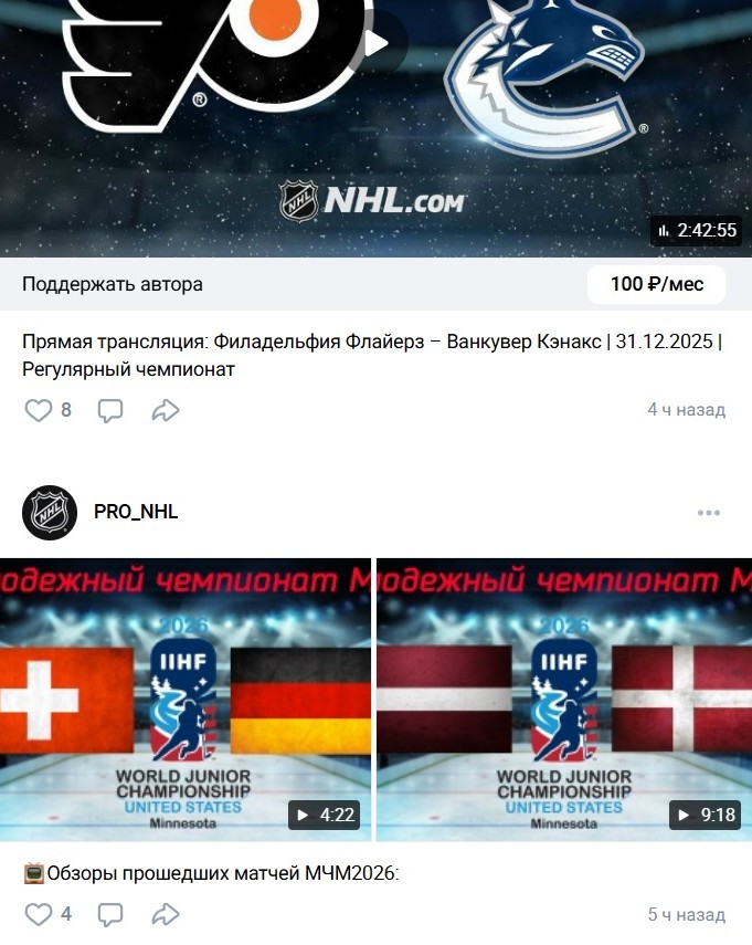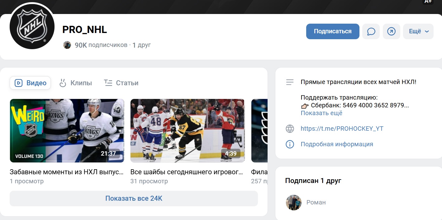 Активность капера сосредоточена не в Telegram, а во ВКонтакте, где собрана внушительная аудитория — более 90 000 подписчиков. Контент бесплатный: новости спорта, обзоры матчей НХЛ, видеотрансляции и комментарии автора. Прогнозы на экспресс или одиночный матч практически не предлагаются, из-за чего канал слабо интересен беттеру и клиенту БК.