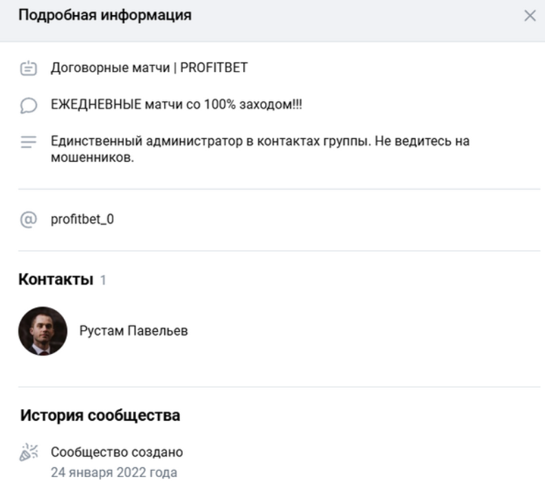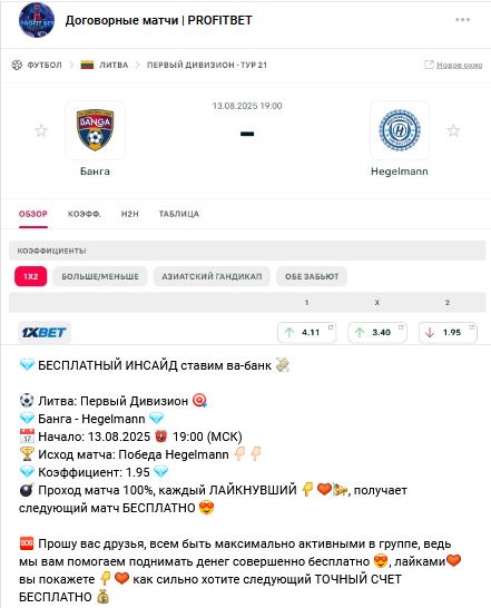 Проект PROFITBET базируется в VK и заточен под продажу инсайдов на договорные матчи. Бесплатные прогнозы встречаются, но они имеет фейковое значение в 100% проходимости. С первых минут нахождения на паблике ожидаем развод, да и схемы мошенничества видим знакомые.