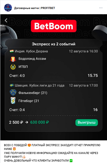 Предложение покупки экспресса с комбинацией из двух точных счетов матчей — явная схема мошенничества. Да-да, именно такое предлагает Руслан. Общий коэффициент всегда больше 200.