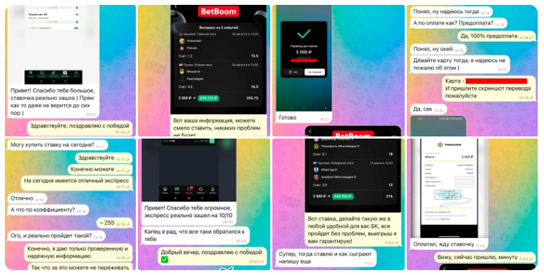 В ленте можно найти отчеты из скринов переписок с клиентами. Они на радостях переводят капперу Рустаму Павельеву заранее оговоренную сумму и благодарят словесно. Жалоб не публикуется.