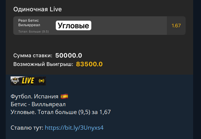 В ленте Телеграмм появляются прогнозы на футбол. К каждой ставке в формате ординара или экспресса руководитель прикладывает небольшое описание. Анализ поверхностный, никакой ценности для игроков не несет. Каппер отбирает матчи из популярных лиг, их вы без труда найдете в своей букмекерской конторе. Советы по работе с банком отсутствуют.