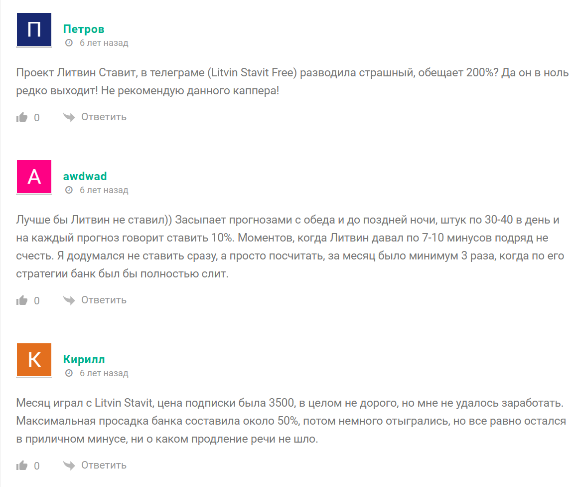 Большинство игроков оставляют жалобы на работу каппера. Когда проект назывался Litvin Stavit Free, игроки отмечали, что в вип чате ежедневно публикуется по 30-40 прогнозов. При этом аналитик предлагает брать от банка по 10%. Это прямой путь к потере суммы менее чем за сутки.