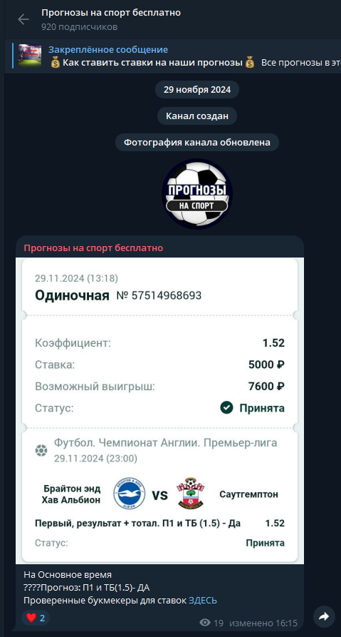 Деятельность канала Прогнозы на спорт бесплатно в Telegram
