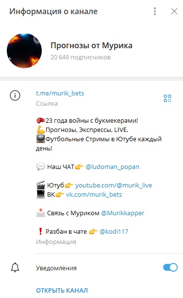 Обзор паблика в Телеграме Прогнозы на спорт от Мурика: статистика, цены, качество аналитики от Мурада Атаева