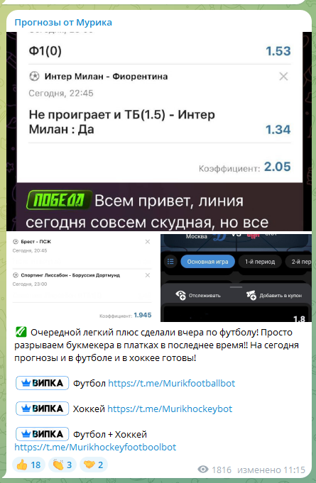 Какой контент публикует автор Телеграмм-канала Прогнозы на спорт от Мурика