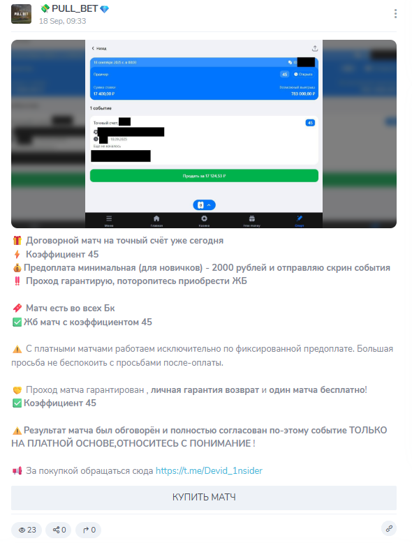Разоблачение очевидно: PULL BET — проект без надежной репутации. Капер Devid_1nsider зарабатывает на продаже прогнозов и сотрудничестве с БК, а клиенты остаются в минусе. Доверять каналу нельзя: риск потерять деньги слишком велик.