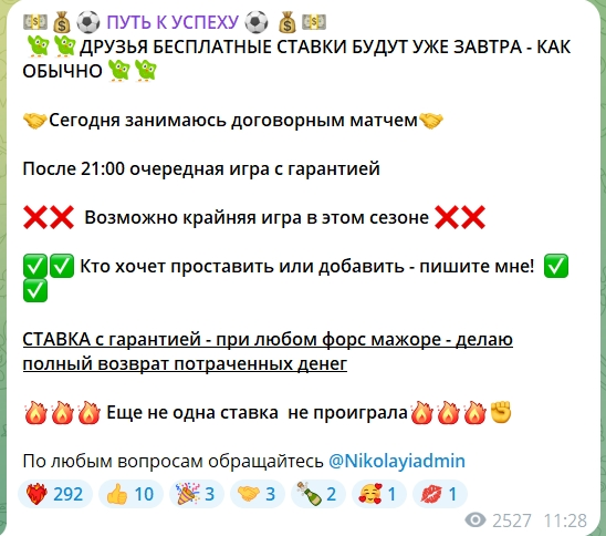 Путь к успеху – это сообщество, ориентированное на спортивные прогнозы, которое ведет каппер Николай Наумов (@Nikolayiadmin). Проект стартовал 22 февраля 2024 года, а его аудитория быстро увеличилась, достигнув более 11 000 подписчиков. Каппер заявляет, что предлагает бесплатные и платные прогнозы с «гарантией», а также публикует статистику по своим ставкам. В описании канала обещан глубокий предматчевый анализ. Мы проверим работу аналитика и сделаем выводы о том, стоит ли ему верить.