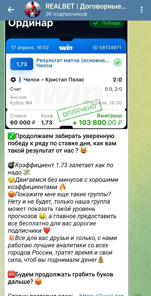 Realbet – это Телеграм-канал, администрируемый анонимным каппером Александром Валловым. Он обещает подписчикам стабильный заработок на ставках на футбол и хоккей. Помимо паблика в Телеграме, аналитик ведет канал в ВК. Каппер совмещает бесплатные прогнозы с продажей договорных матчей и экспрессов. В ленте канала регулярно публикуются рекламные посты с реферальными ссылками на букмекерскую контору 1Win. А значит, прогнозист напрямую заинтересован в проигрыше клиентов. Мы проверим деятельность Александра Валлова и сделаем объективные выводы о том, стоит с ним сотрудничать или нет.