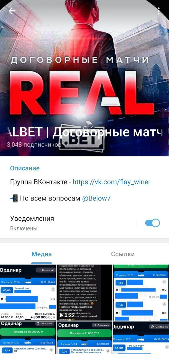 Реальной статистики в канале Realbet нет. Проходимость ставок заявляется на уровне близком к 100%, особенно по договорным матчам. Неудачные прогнозы не публикуются, верификация через независимые платформы отсутствует. Это делает оценку эффективности ставок невозможной.