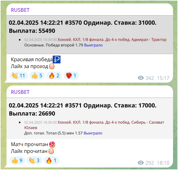 Rusbet – это один из аналитических каналов в ТГ, создателем и администратором которого является капер Рустам Жамальдинов. Зачастую в ленте он размещает пари на события по хоккею КХЛ, МХЛ и NHL. Подписчикам обещает невероятно большую прибыль в ставках на спорт.