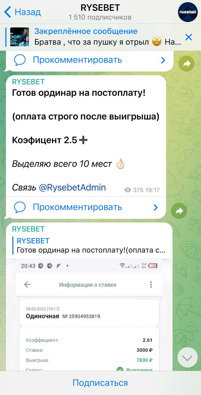 Цены на услуги в Rysebet в Телеграме, наличие вип-чата