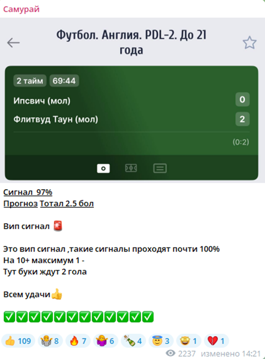 Каждый день в сообществе публикуется несколько сигналов на ставки в футбольных матчах. Прогнозист чаще всего выкладывает пари по ходу встречи, а вот прогнозы по линии в ленте почти отсутствуют. Какая-либо аналитика по командам отсутствует. В записях нет даже минимального разбора с мнением каппера @SamAdmin123. Зато в постах прогнозист регулярно пишет о проходимости в 90 процентов и выше. Подобные заявления звучат сомнительно. Коэффициенты у бесплатных пари находятся в диапазоне от 1.5 до 2.5. Информации по платным предиктам в открытом доступе почти нет. Автор изредка делится купонами пари из вип-чата с платным доступом.