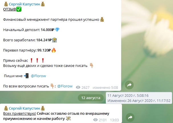 Интересный момент: контакты автора регулярно менялись. Сегодня он @Florow, до этого — @sergemoney и @moneymakerbetzz. Частая смена имен — распространенный прием в мошеннических схемах. Подписчики замечают подозрительное — он создает новый аккаунт и продолжает обманывать аудиторию.