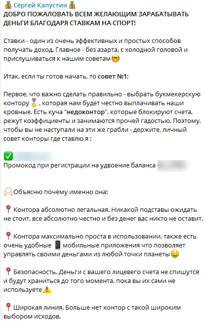 Отдельная тема — реклама одной букмекерской конторы. Сергей чуть ли не в каждом посте делился реферальной ссылкой с промокодом: «получите бонус за регистрацию — и я помогу вам с раскруткой счета, а дальше делим деньги пополам».
