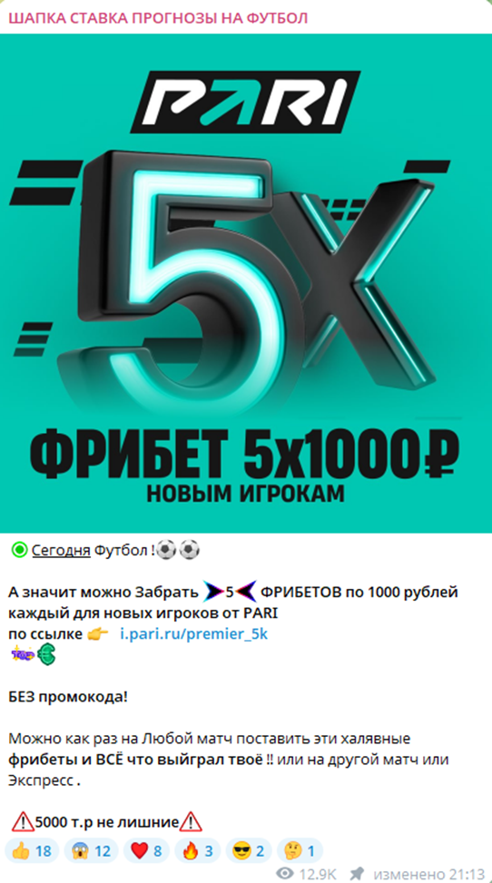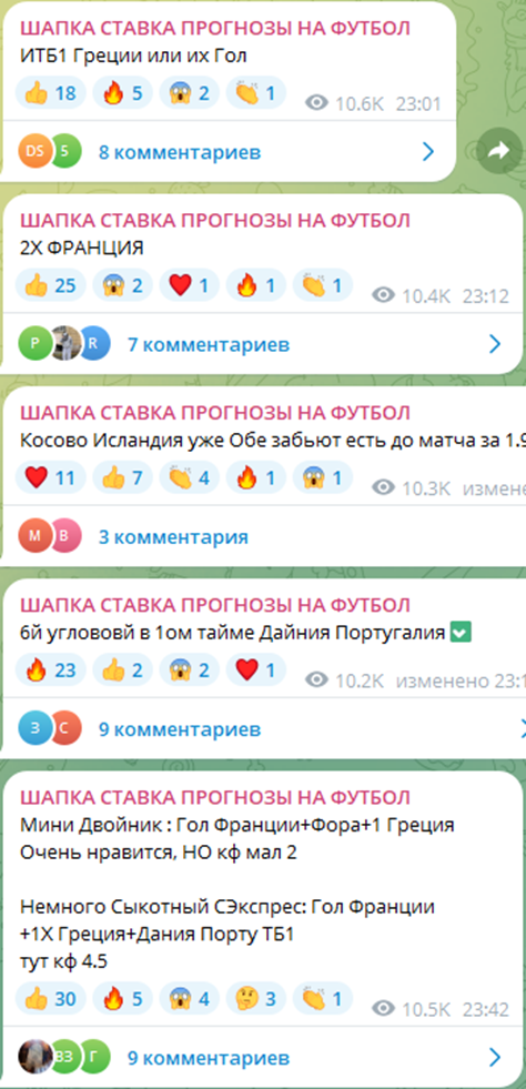 В телеграмм-канале «Шапка Ставка» прогнозы на футбол выкладываются бесплатно. Для получения совета по пари на ближайшие матчи достаточно зайти в открытую группу. Каппер в большинстве случаев рассматривает встречи известных команд из топовых лиг. Каждый день подписчики получают несколько предиктов, вот только они не сопровождаются качественной аналитикой. Автор публикует как ординары по линии, так и делится мыслями по уже идущим в реальном времени играм. Коэффициенты по прогнозам редко превышают показатель 1.8. Иногда в ленте появляются экспрессы с котировками около 2.0.