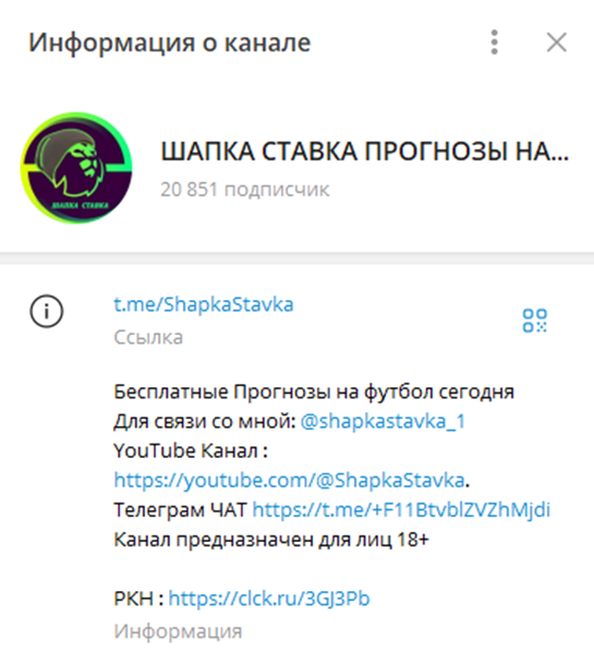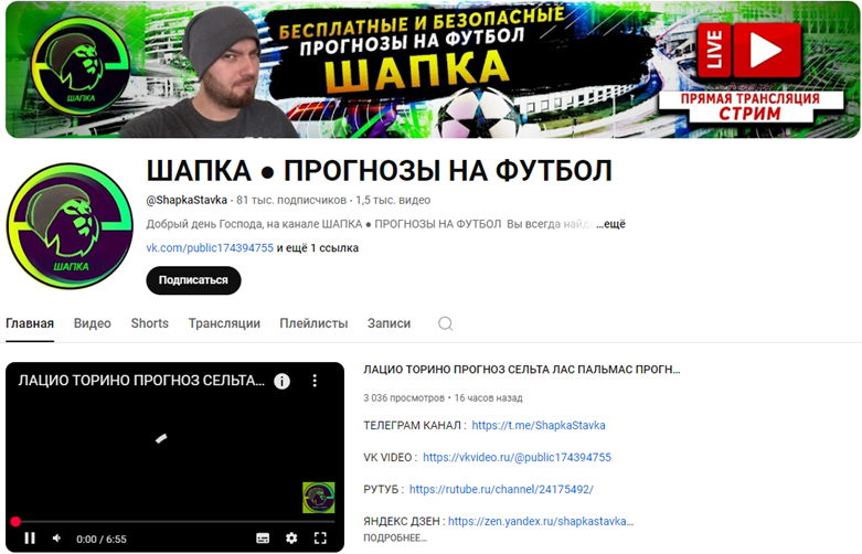 «Шапка ставка прогнозы на футбол» - такое название носит проект с бесплатными ставками по футболу. Есть у ресурса «Шапка Ставка» телеграмм-канал, канал на ютубе и сообщество во вконтакте. На видеохостинге за контентом следят 80 000 пользователей, а новые ролики появляются раз в несколько дней.