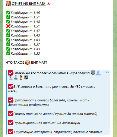В данных обстоятельствах продажа подписки на вип-чат — услуга на грани мошенничества. Статистика проходимости заявлена в 84%, дается гарантия прибыли. Но снова обратите внимание на низкие кф — к ощутимому заработку такой метод игры не приведет, лишь к постепенной просадке банка.