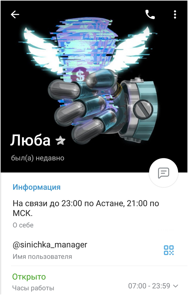 В описании сообщества указана ссылка на профиль менеджера @sinichka_manager. О нем известно лишь имя – Люба и график работы. Больше никакой информации в профиле нет. Собственно, нет ее и в телеграмм-канале.