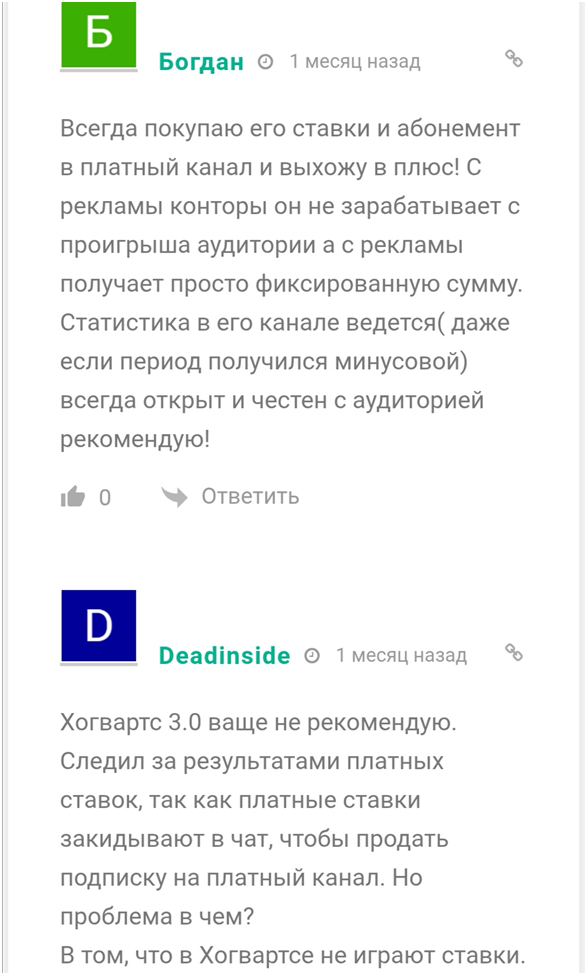В интернете есть много отзывов о данном телеграмм-канале, и среди них нам не удалось встретить резко негативных. Мы обнаружили примерно равное количество положительных и отрицательных отзывов. Некоторые пользователи пишут, что покупают всегда подписку на платный канал Хогвартс 3.0 и выходят в плюс.