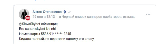 В свободном доступе мы нашли всего пару отзывов о канале и его владельце SlavaSkybet. Обманутые беттеры возмущены деятельностью прогнозиста, никому не советуют заключать с ним пари. Утверждают, что проиграли со Славой слишком много денег – ни одна из ставок не оказалась прибыльной.
