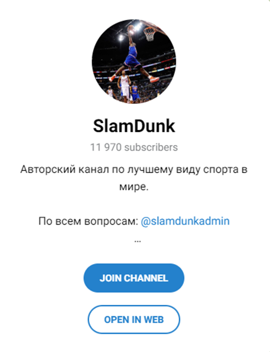 Описание сообщества гласит, что всех подписчиков ждет авторская аналитика по баскетбольным матчам. Другие виды спорта наш сегодняшний герой не рассматривает. К слову, настоящее имя и личность создателя телеграмм-канала SlamDunk установить не удалось. Каппер не оставил ссылок на другие страницы проекта и свои личные аккаунты в социальных сетях. Для связи с аудиторией основатель ресурса использует профиль @slamdunkadmin.