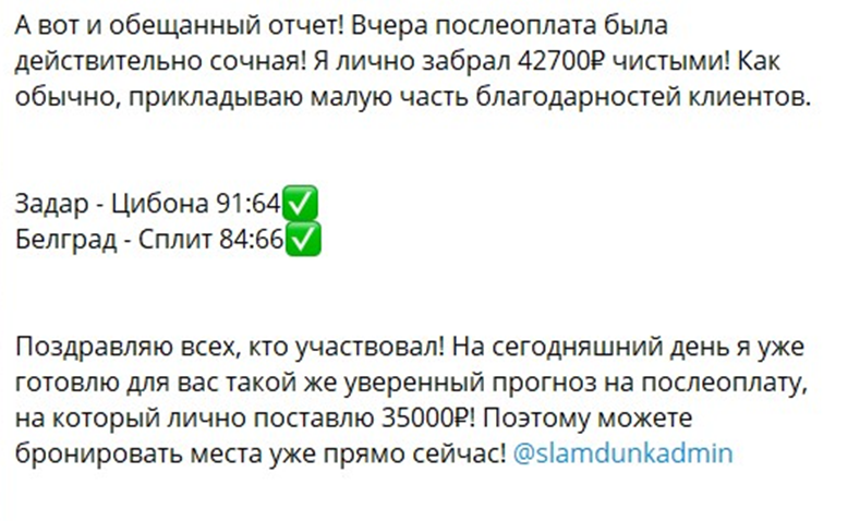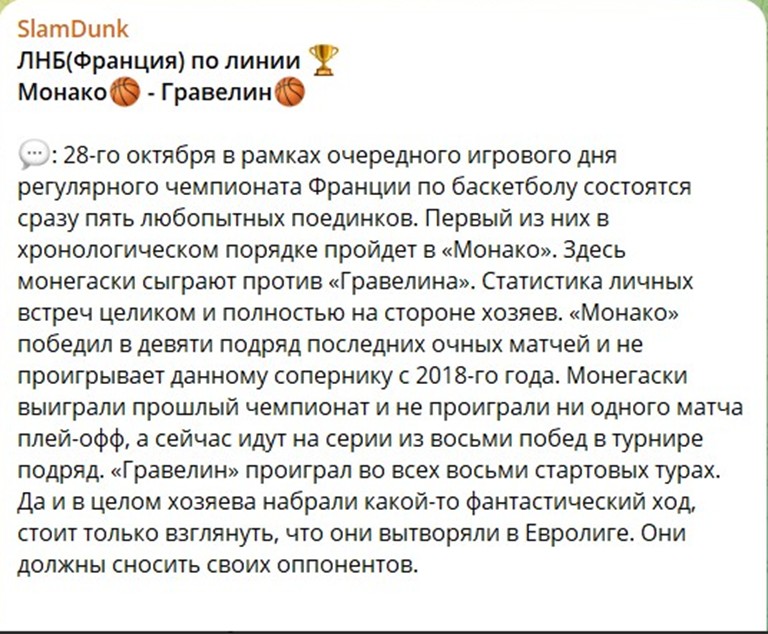 Однако записывать в плюсы сообщества наличие развернутого авторского комментария не стоит. Дело в том, что при дальнейшей проверке проекта удалось выявить факт использования чужих материалов. Наш герой берет описания из других источников и выдает их за собственный анализ баскетбольных матчей. Из-за этого бесплатные пари в паблике нужно игнорировать, так как неизвестно откуда в следующий раз автор возьмет предикт. Получить от создателя телеграмм-канала SlamDunk прогнозы с коэффициентами около 2 можно только за определенную сумму.