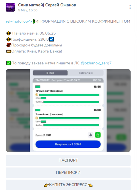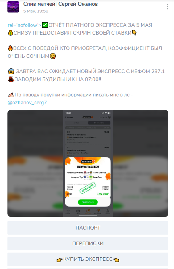 - Спекуляция на теме договорных матчей и попытки продать юзерам сомнительные экспрессы;