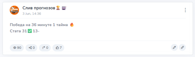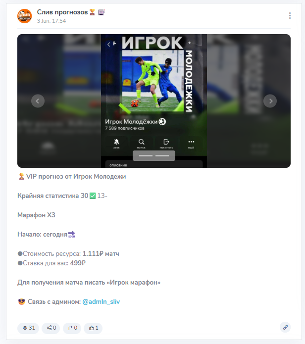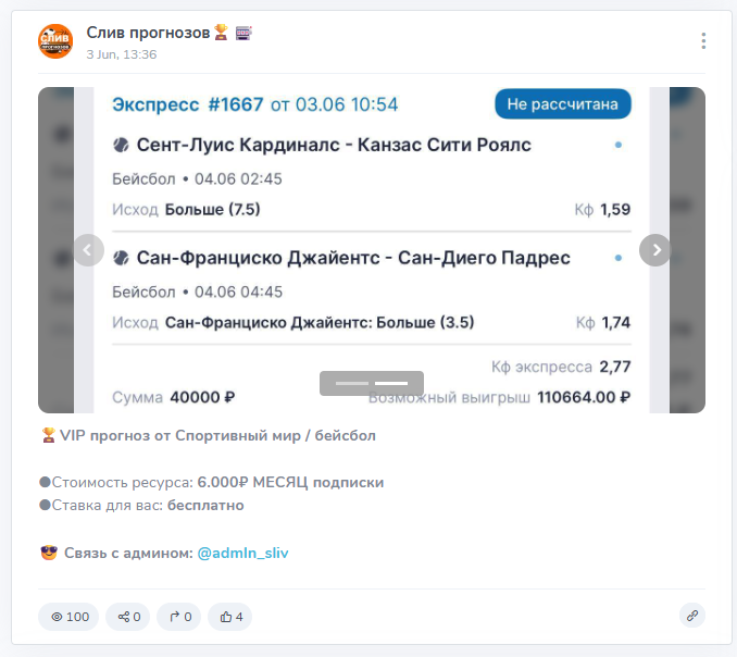 Слив Прогнозов — канал капера в Telegram, но в рамках ресурса нет авторских прогнозов на матчи. Проект нацелен на сливы ставок на спорт от профессиональных аналитиков. Админ телеграм-канала сообщает, что размещает в ленте бесплатные пари от популярных прогнозистов. Также предлагает приобрести некоторые ставки «в 10 раз дешевле оригинала». Нередко схемы мошенничества прикрывают выгодным предложением. Поэтому наши эксперты начали проверку. В разоблачении будет рассмотрена информация о репутации проекта и оценены риски для беттеров.