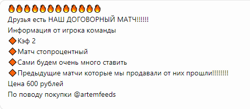 Второй платной услугой проекта являются ставки на договорные матчи. Автор дает гарантию на 100% проходимость и утверждает, что сам ставит на данный исход крупную сумму. Стоимость одного договорняка – 600 рублей.