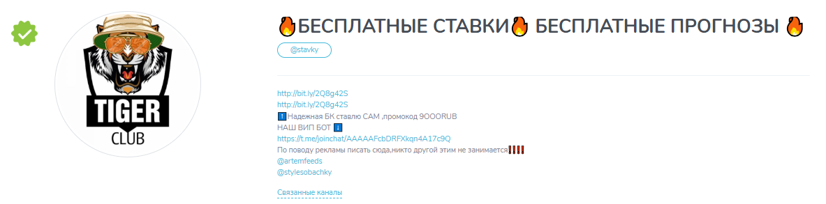 Часто в ленте встречается реклама сомнительных ресурсов. Причем многие из них уличены в мошенничестве и имеют крайне негативную репутацию на профильных сайтах. В описании Телеграм-канала Бесплатные ставки Бесплатные прогнозы есть ссылка на букмекерскую контору. Ее наличие указывает на то, что дополнительный доход аналитику приносит сотрудничество с букмекером. То есть капер получает процент от каждого проигрыша привлеченных клиентов.