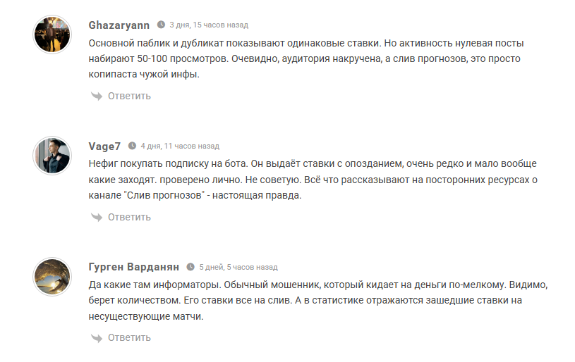 Оставлять комментарии невозможно ни на одном из каналов Слив прогнозов. Но в лентах регулярно появляются положительные отзывы. Капер размещает скрины переписок с довольными клиентами, который заявляют о выигрышах платных ставок.