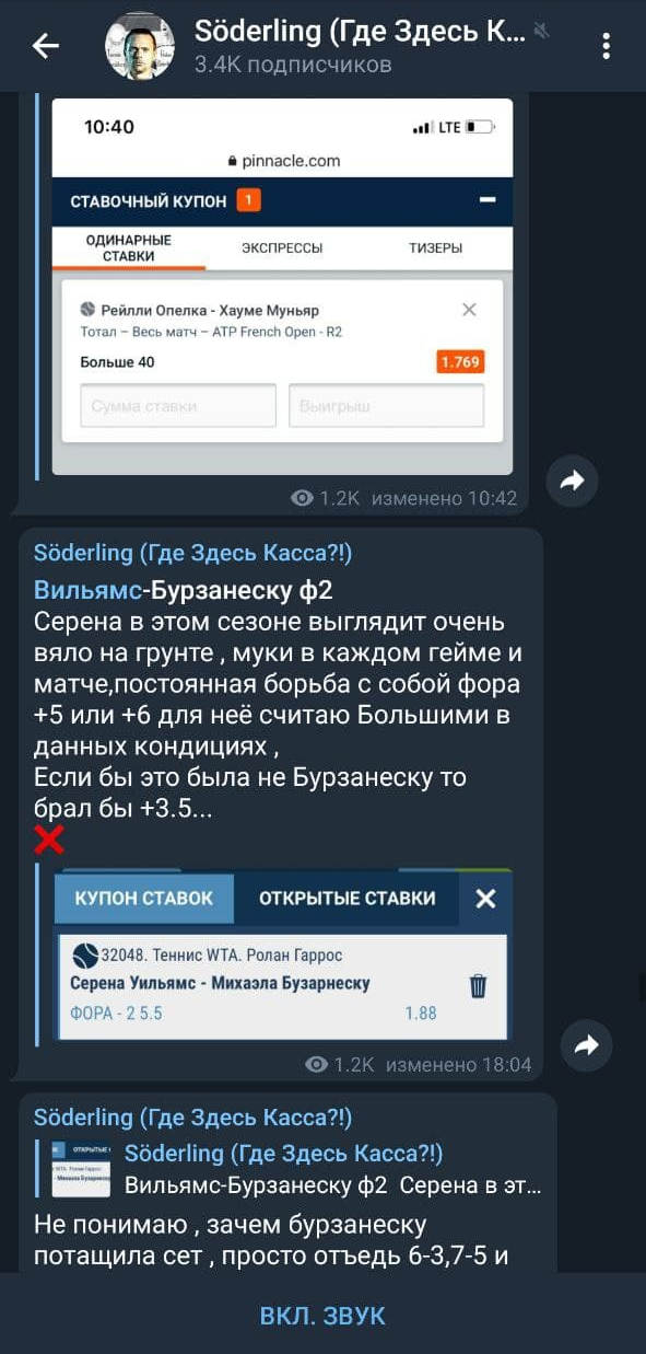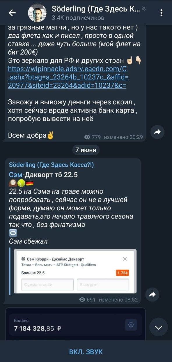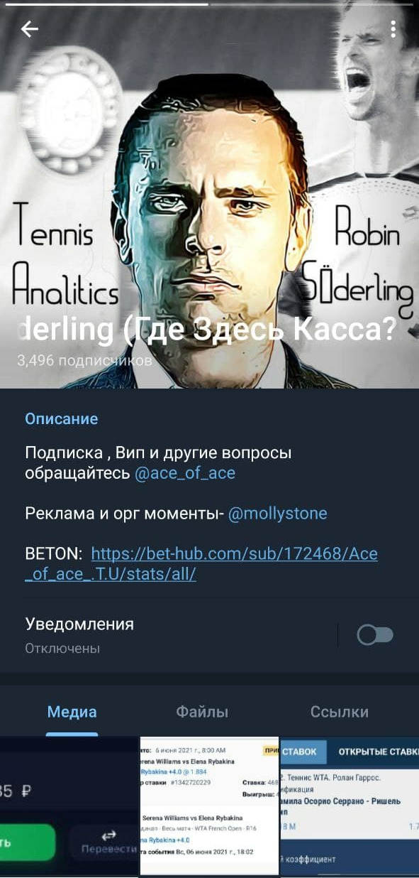 Soderling – это старое название ТГ канала Tennis Bet, котором публикуются ставки на теннис. Проект был запущен в августе 2020 года. Администратором выступает каппер под ником Ace_of (контакт: @ace_of_ace). Автор утверждает, что имеет 17-летний опыт в ставках и тесно связан с теннисом как спортсмен. Однако документальных подтверждений этим заявлениям нет. Каппер не участвует в реферальных схемах с букмекерскими конторами. В ленте можно встретить упоминания БК, но без реферальных линков. Мы проверим деятельность аналитика Ace_of и сделаем выводы о том, заслуживает ли он доверия