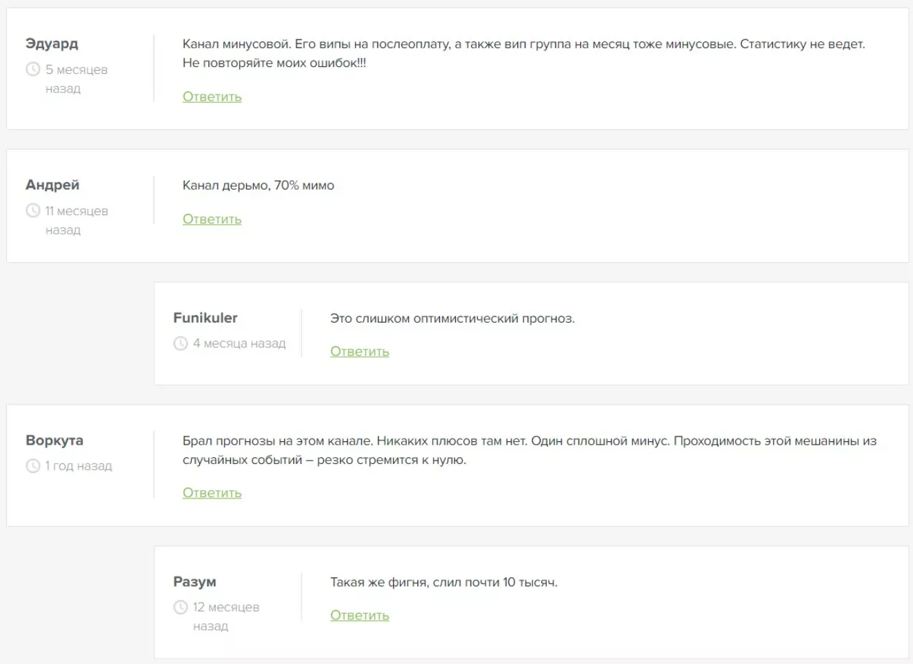 Комментарии в ленте отсутствуют, узнать мнение игроков о сотрудничестве нельзя. Периодически публикуются скрины переписок, где восторженные беттеры якобы благодарят прогнозиста за верную ставку. Достоверность таких картинок сомнительна, их легко подделать.