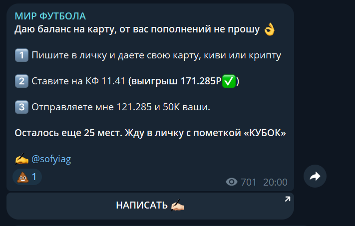 В своих telegram-каналах София Гордеева предлагает клиентам делать ставки на футбольные матчи и получать реальный доход. Все игры проходят в крупных турнирах. Работа ведется с бигмаркетами в лайве и прематче. Ставить нужно на форы, тоталы, основной исход.