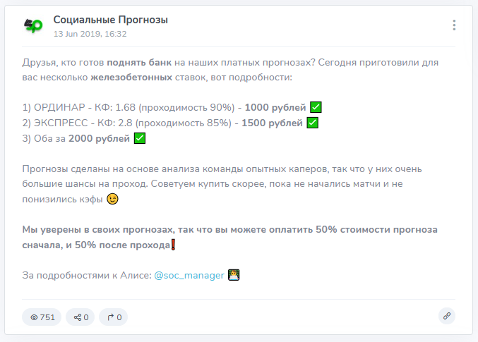 В ленте есть реклама букмекерской конторы. Есть вероятность, что прогнозист получает доход за счет проигрышей своих клиентов. Также возможно, что его прибыль зависит от привлеченных новичков.