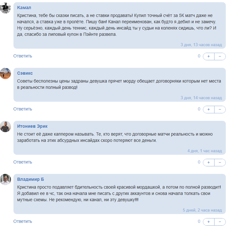 Комментариев довольных подписчиков нет. Положительные отзывы капер публикует регулярно. На профильных сайтах у Kristiina inform негативная репутация. Есть разоблачения развода и жалобы беттеров.
