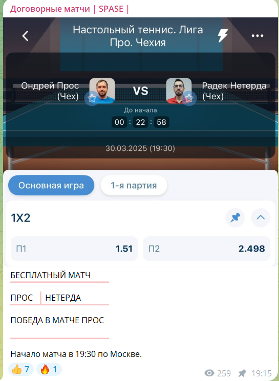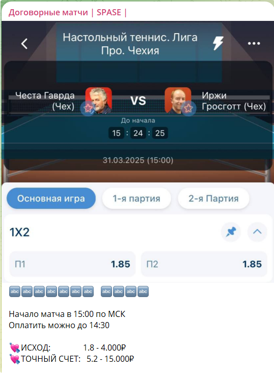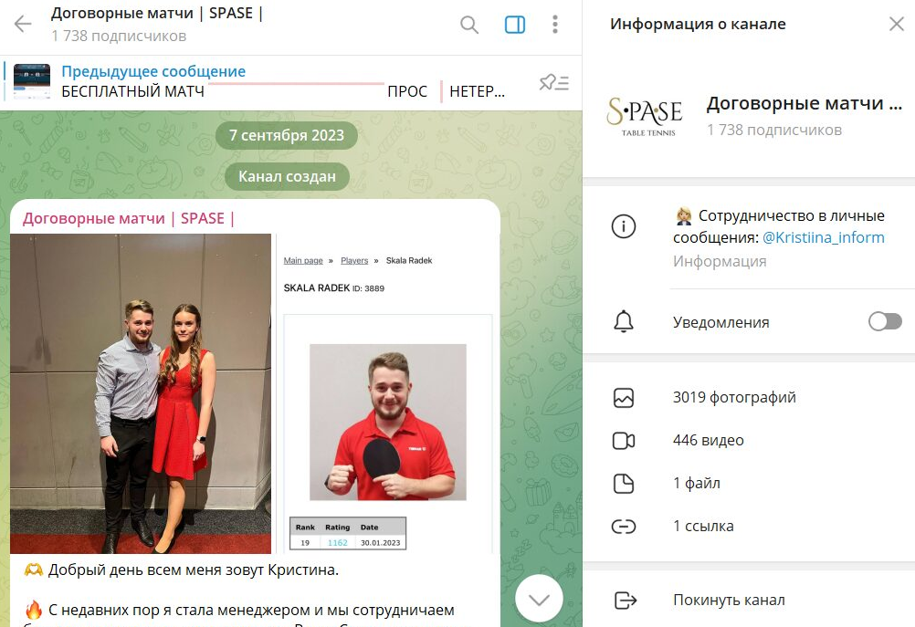 Владелец Телеграмм-канала Договорные Матчи Spase предлагает аудитории стабильный заработок на ставках на настольный теннис. Капер специализируется на подставных событиях, демонстрируя плюс к банку с бесплатных и платных предиктов. Разбираемся, насколько надежным является аналитик проекта.