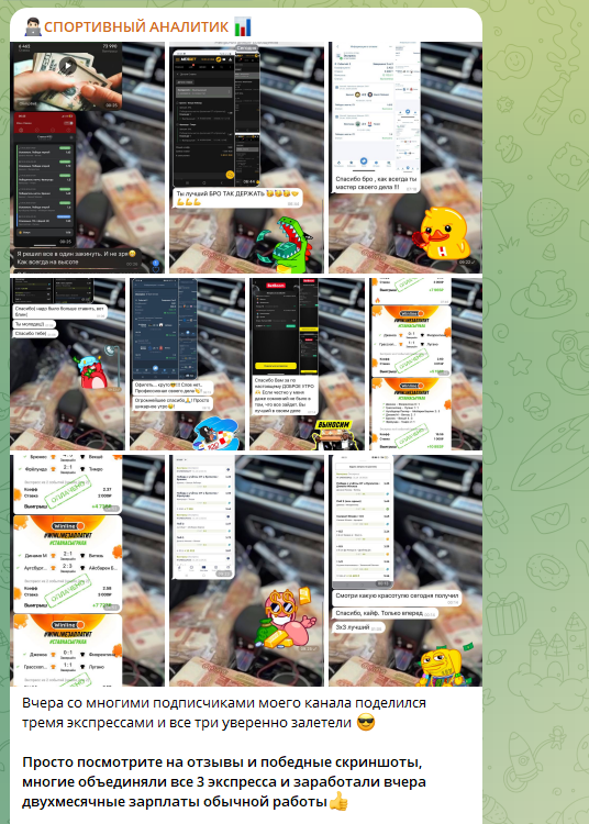 Капер активно размещает на канале положительные отзывы и победные скриншоты. Этим он пытается подтвердить, что прогнозы оправдывают свою цену.