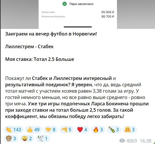 Подробной статистики пари в канале Спортивный спектакль не было. Капер лишь размещал посты, где сообщалось, сыграл прогноз или нет. При этом, в ленте можно было видеть почти одни плюсы. Мы подозреваем, что минусовые прогнозы просто вовремя удаляли.