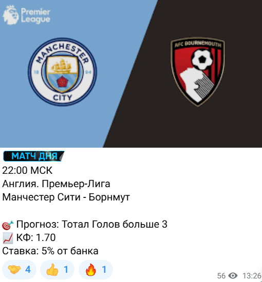 Платных прогнозов, ВИП-чатов или экспрессов на канале нет. Реклама услуг ведется без агрессивного давления, что, в общем, плюс.