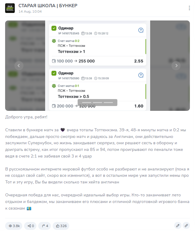 Телеграмм-канал Старая школа Бункер: отзывы, результаты ставок на спорт, на чем зарабатывает каппер oldschool bet