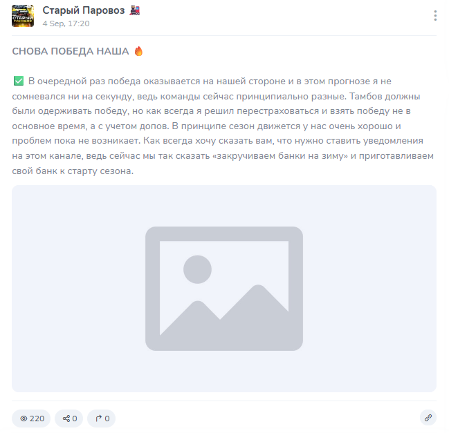 Телеграмм-канал Старый Паровоз нельзя назвать надежным ресурсом для беттеров. Репутация каппера вызывает сомнения, а его проект напоминает схему развода. Проходимость прогнозов не подтверждена.