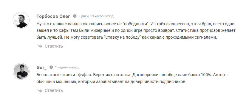 На независимых платформах отзывы о проекте Ставка на победу преимущественно негативные. Пользователи сообщают о том, что после перевода денежных средств не получают никаких результатов. Попытки запросить возврат остаются без ответа. Нередко каппер просто блокирует пользователя после получения оплаты.