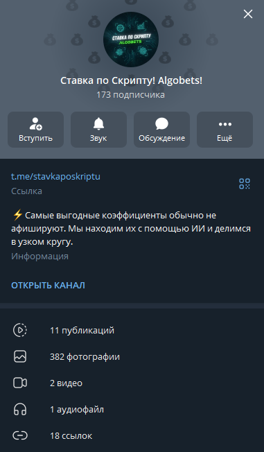 Телеграмм-канал «Ставка по Скрипту Algobets»: отзывы подписчиков и итоги анализа деятельности капера Algobets