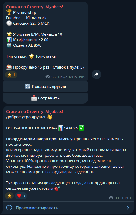 Телеграм-канал «Ставка по Скрипту Algobets»: качество прогнозов и результаты анализа деятельности капера Algobets