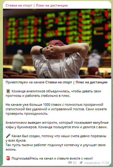 Телеграм-канал «Плюс на дистанции» имеет аудиторию из 900 пользователей мессенджера. Николай Романов объединил вокруг себя каперов, которые стабильно делают доход с беттинга, но подобные сообщения не сопровождаются фотографиями или ссылками на соц.сети.