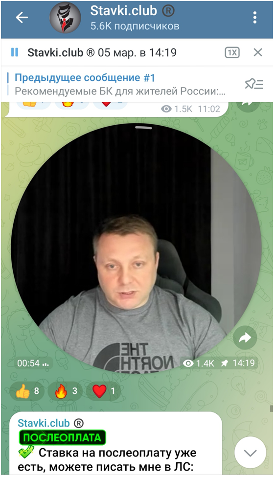 В ленте написано, что прогнозы формирует команда аналитиков, однако ни одна персона не представлена. Нет никаких контактов, кроме непосредственно самого Антона Кошелева, который в телеграмм-канале нередко записывает даже кружочки. У него есть и профиль по ссылке @stavkiclub2018, в котором нет ни информации о человеке, ни фотографии. Ну, в общем, лицо-то мы видим на кружочках.
