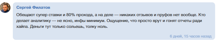 Основной упор делается на платный ВИП-чат стоимостью 3 000 рублей. При этом отсутствуют какие-либо гарантии, отчеты на дистанции и подтверждение результатов через верификатор. Статистика ограничивается скринами купонов с отметками «плюс» или «минус», что легко подделывается и не отражает реальную проходимость.
