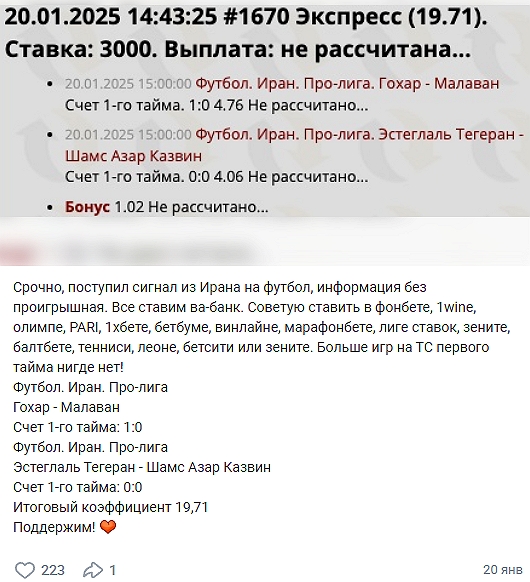 Важно понять — никто и никогда не будет организовывать «заказуху» в угоду непонятным персонажам в Телеграм и ВК, поэтому истории об «информаторах из Ирана» и аналогичные — банальный развод игроков. Подавляющее большинство российских и даже зарубежных беттеров вряд ли сходу назовут даже состав команд -участников «Про-Лиги» этой страны, не говоря о более-менее внятной аналитике турнира.